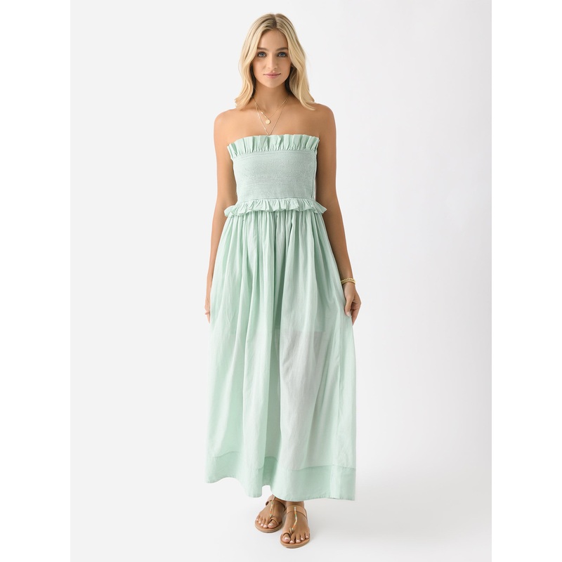 DESCRIPTION:A strapless maxi dress made from a lightweight cotton blend with a shirred bodice with bubble frill trims.FEATURES:Strapless NecklineSmocked BodiceRuffle TrimsGathered SkirtMaxi Silhouette52% Cotton, 48% ViscoseClassic FitModel is wearing size