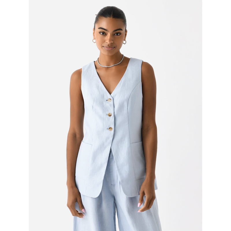 DESCRIPTION:A longline vest made from lightweight linen with a flattering tailored design.FEATURES:V-NecklineButton ClosureFront PocketsBack Adjustable BuckleCurved Hem100% LinenTailored FitModel is wearing size Small vest.Model's Measurements: Height: 5'8