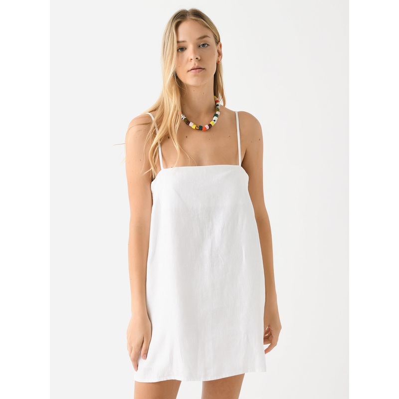 DESCRIPTION:A fully lined mini dress made from lightweight linen with adjustable straps and a flattering billowy silhouette.FEATURES:Square NecklineThin, Adjustable StrapsBack Zip ClosureSide PocketsMini Silhouette100% LinenClassic FitModel is wearing size
