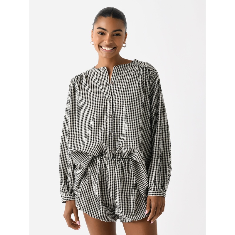 DESCRIPTION:A gingham-printed blouse made from lightweight cotton with long billowy sleeves.FEATURES:Round NecklineBalloon SleevesButton-Down FrontShirttail HemAll-Over Gingham Print100% CottonRelaxed FitModel is wearing size Small shirt.Model's Measuremen