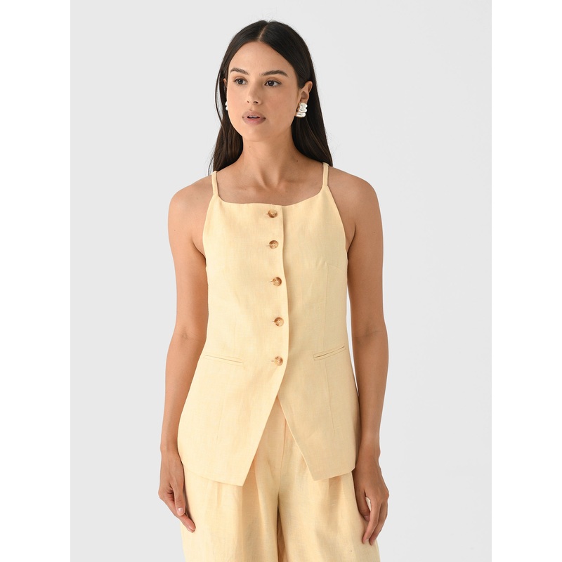 DESCRIPTION:The Nancy Vest is expertly tailored from an exclusive linen handloom for a close and flattering fit. It features distinctive mottled buttons and falls to a stylish split hem.FEATURES:Boat NecklineThin, Fixed StrapsButton ClosureWelt PocketsBack