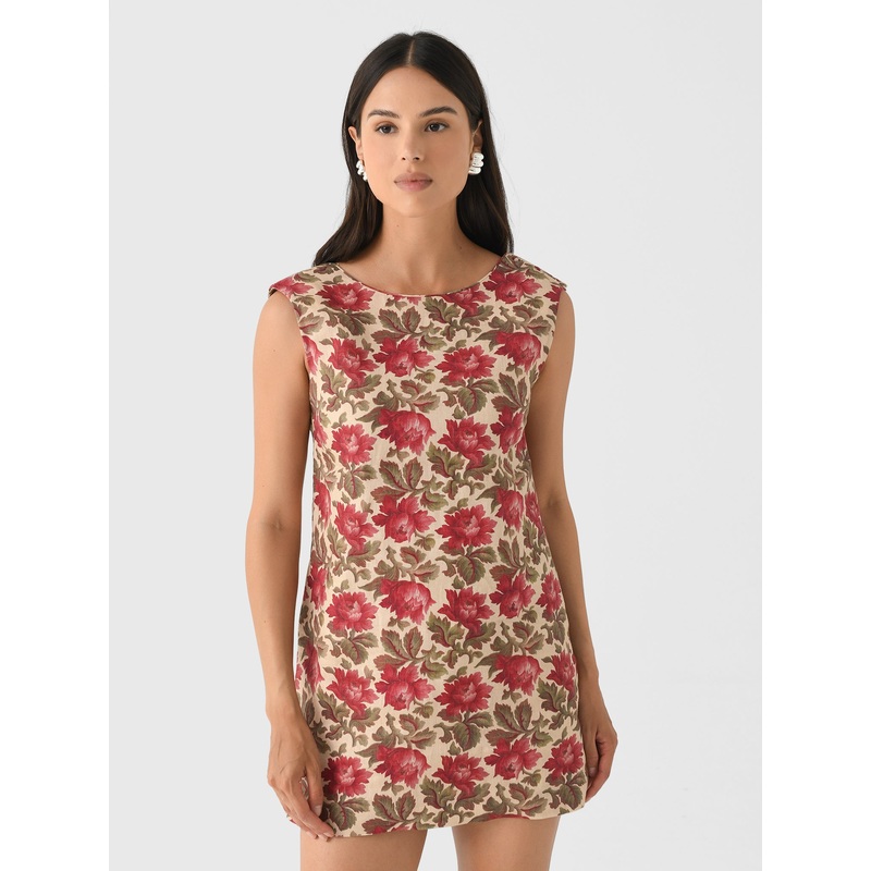 A comfortable shift-style mini dress made from lightweight linen featuring an antique-inspired floral print and a low scoop back.