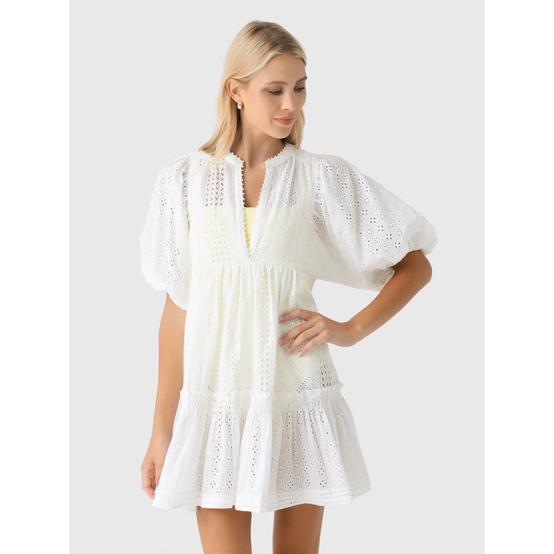 DESCRIPTION:Step into effortless elegance with this trapeze dress, featuring a breezy silhouette crafted from delicate cotton eyelet lace. Billowing balloon sleeves add a touch of whimsy, while the tiered skirt creates graceful movement. FEATURES:V-Necklin