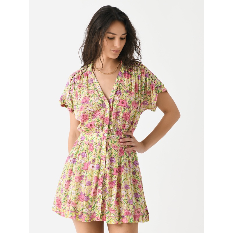 DESCRIPTION:A floral-printed romper with a soft and airy design.FEATURES:V-NecklineStitched ShouldersButton-Down FrontSide PocketsEmbroidered TrimAll-Over Novelty Print100% ViscoseClassic FitModel is wearing size Small romper.Model's Measurements: Height: