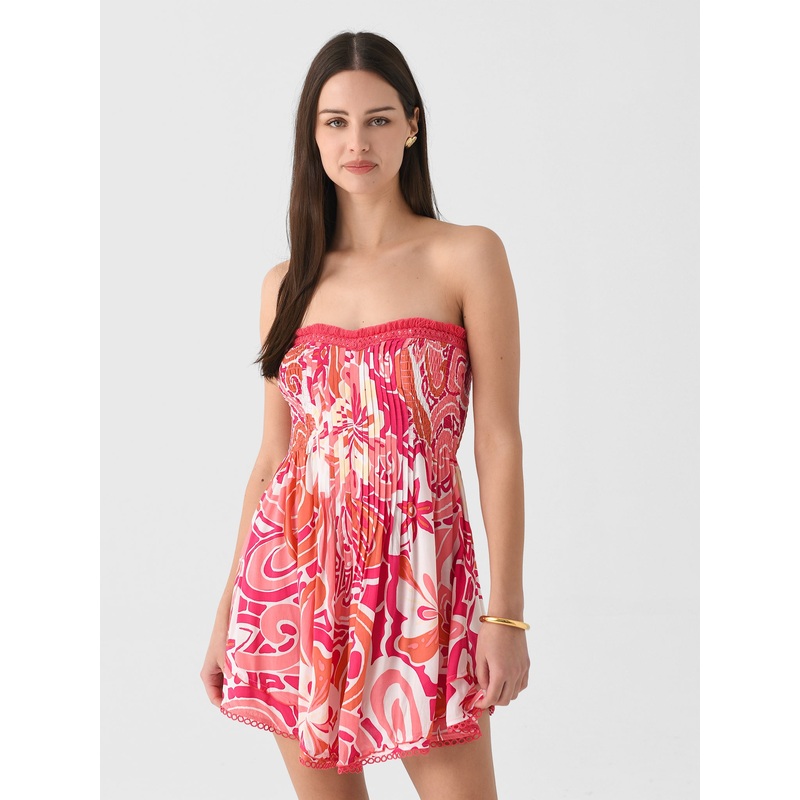 DESCRIPTION:Embrace effortless summer style with this bandeau dress. Its captivating print and flowing silhouette evoke a sense of relaxed elegance, perfect for warm days or beach getaways.FEATURES:Strapless NecklineFringe TrimPleated BodiceSmocked BackCro