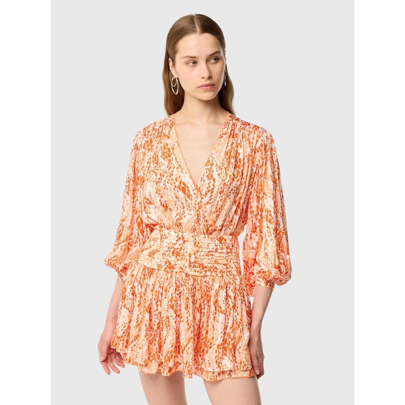 DESCRIPTION:This feminine mini dress features an elegant V-neckline and billowy sleeves. The pleated waist creates a flattering silhouette, while the ruffled skirt adds a playful sense of movement.FEATURES:V-NecklineBlouson SleevesBack Tie ClosurePleated W