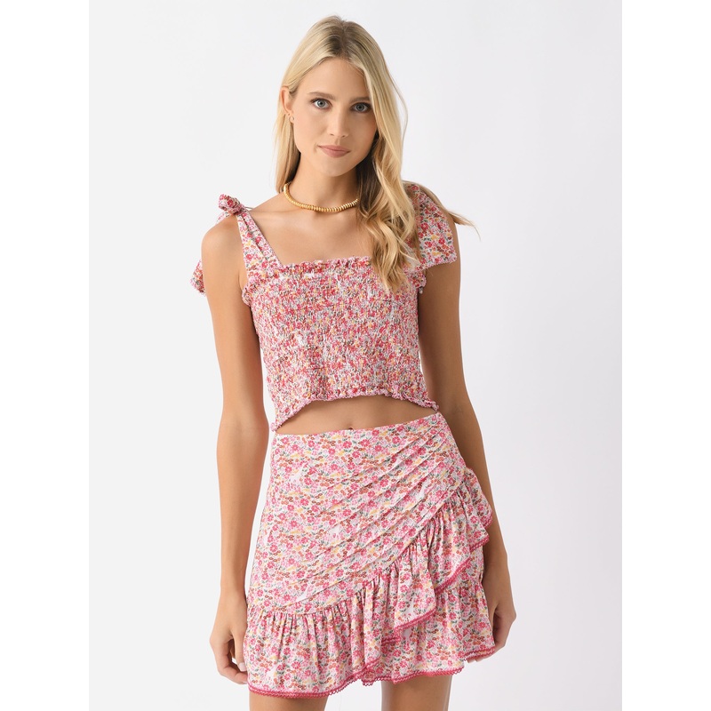 DESCRIPTION:A slightly cropped smocked top with self-tie straps and a dainty floral print.FEATURES:Square NecklineSelf-Tie StrapsSmocked ConstructionCropped SilhouetteAll-Over Novelty Print100% ViscoseClassic FitModel is wearing O/S top.Model's Measurement