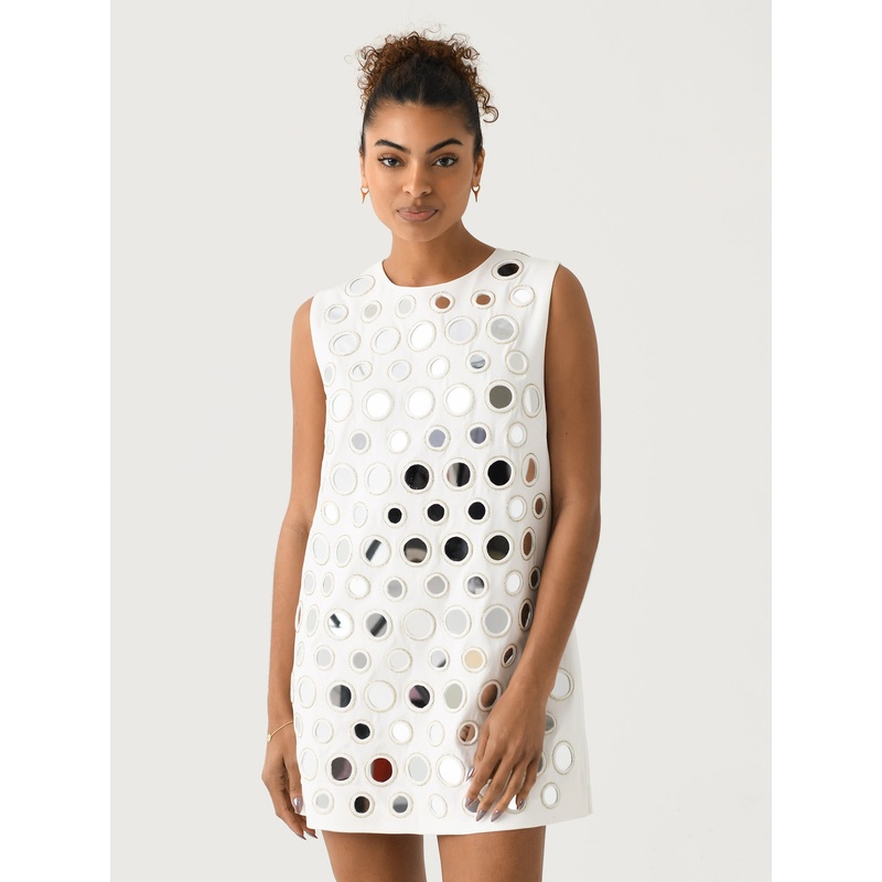 DESCRIPTION:A flattering A-line mini dress with a shift silhouette adorned with reflective mirror-style embellishments.FEATURES:Round NecklineBack Zip ClosureSleevelessMirror EmbellishmentsMini LengthA-Line Silhouette100% PolyesterClassic FitModel is weari