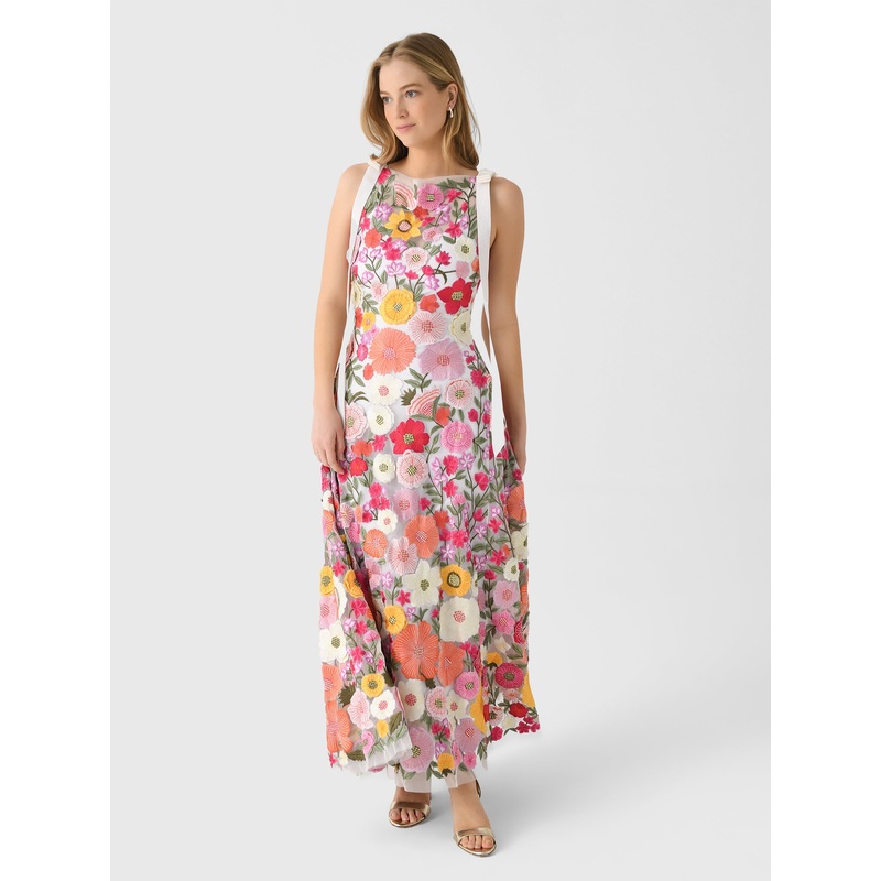 DESCRIPTION:This elegant dress features delicate shoestring straps, intricate hand-embroidered florals, and a flowing silhouette. It also includes a slip for added coverage.FEATURES:Square NecklineBack Zip ClosureAdjustable StrapsColumn SkirtMaxi Silhouett