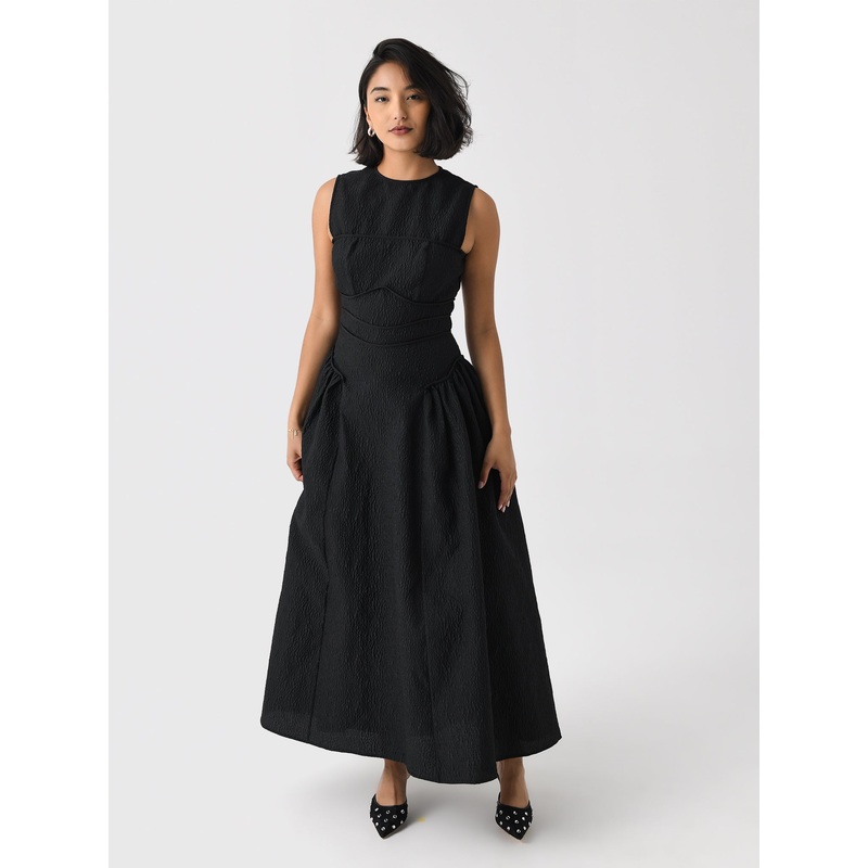 DESCRIPTION:A flattering maxi dress made from textured jacquard fabric and finished with a fitted bodice with piping details and a full skirt.FEATURES:Round NecklineBack Zip ClosureSleevelessGathered BodicePiping DetailsFull SkirtMaxi Silhouette56% Polyest