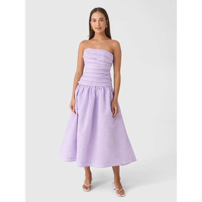 DESCRIPTION:The Sophia Strapless Dress embodies sculptural elegance. Featuring a drop waist and voluminous silhouette for a striking, flattering shape, its draped corset adds structure and a tailored fit. Crafted from a lightweight, textured jacquard for a