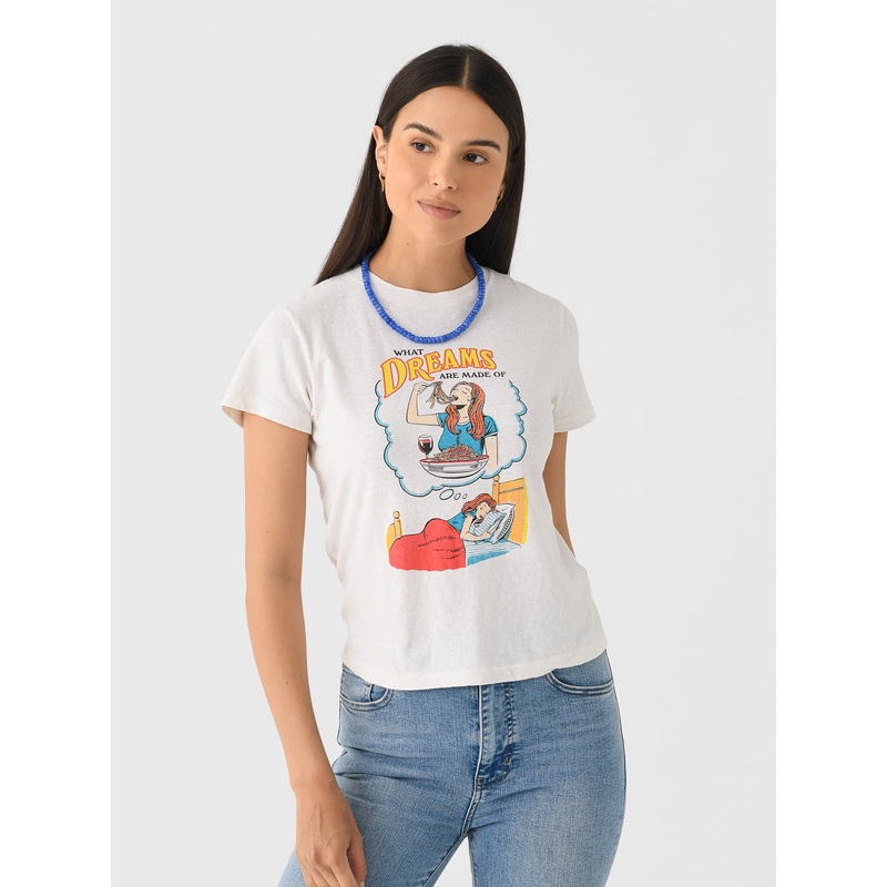 DESCRIPTION:A casual white tee with a fun, food-themed graphic, perfect for everyday wear.FEATURES:Crew NecklineShort SleevesFront Graphic100% CottonClassic FitModel is wearing size Small tee.Model's Measurements: Height: 5'10.5" | Bust: 32B | Waist: 24.5"