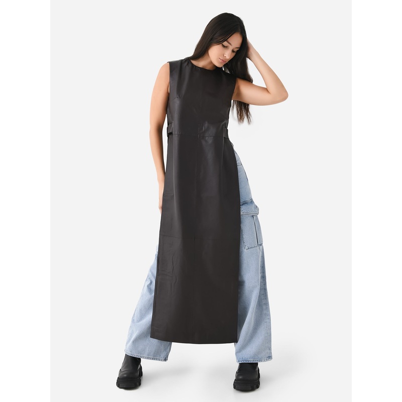DESCRIPTION:Maxi-length lamb leather vest with open, adjustable sides.FEATURES:Round NecklineSleevelessAdjustable SidesSide CutoutsLong Silhouette100% LeatherClassic FitModel is wearing size 34 vest.Model's Measurements: Height: 5'9" | Bust: 32B | Waist: 2