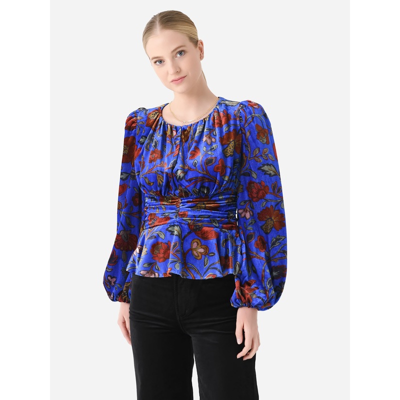 DESCRIPTION:Velvet blouse with a ruched banded waist and slight peplum hem.FEATURES:Round NecklineKeyhole DetailPuff SleevesRuched WaistPeplum HemAll-Over Novelty PrintVelvet Fabrication75% Rayon, 25% NylonClassic FitModel is wearing size 2 top.Model's Mea