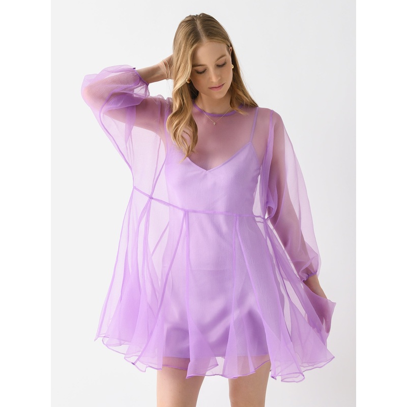 A polyester organza dress with blouson sleeves, a flared skirt, and a slip dress lining.
