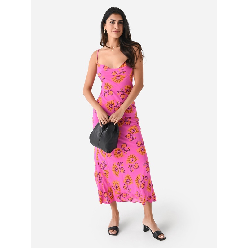 DESCRIPTION:Figure-flattering full-length dress reminiscent of the simple 90s silhouette.FEATURES:Cowl NecklineThin, Adjustable StrapsBack Tie ClosureMaxi SilhouetteAll-Over Novelty Print100% ViscoseClassic FitModel is wearing size 2 dress.Model's Measurem