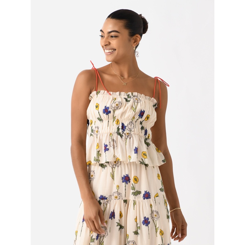 DESCRIPTION:A gathered peplum-style top made from a lightweight cotton blend with a muted floral print.FEATURES:Square NecklineSelf-Tie StrapsGathered BodicePeplum HemAll-Over Novelty Print52% Organic Cotton, 48% ViscoseClassic FitModel is wearing size Sma
