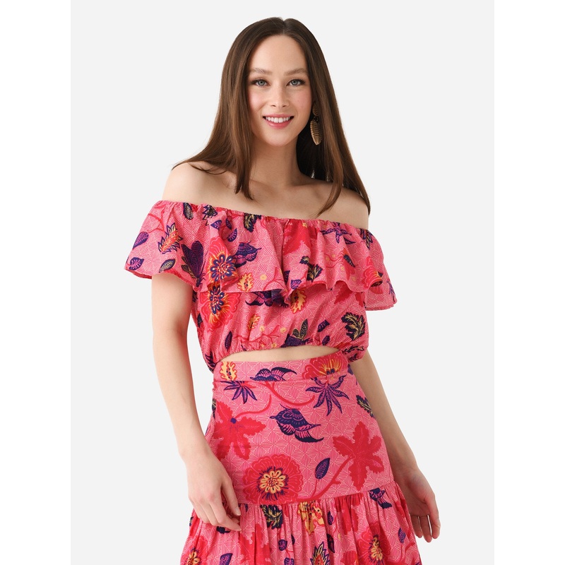 Colorful printed top with a ruffle overlay and slightly cropped silhouette.