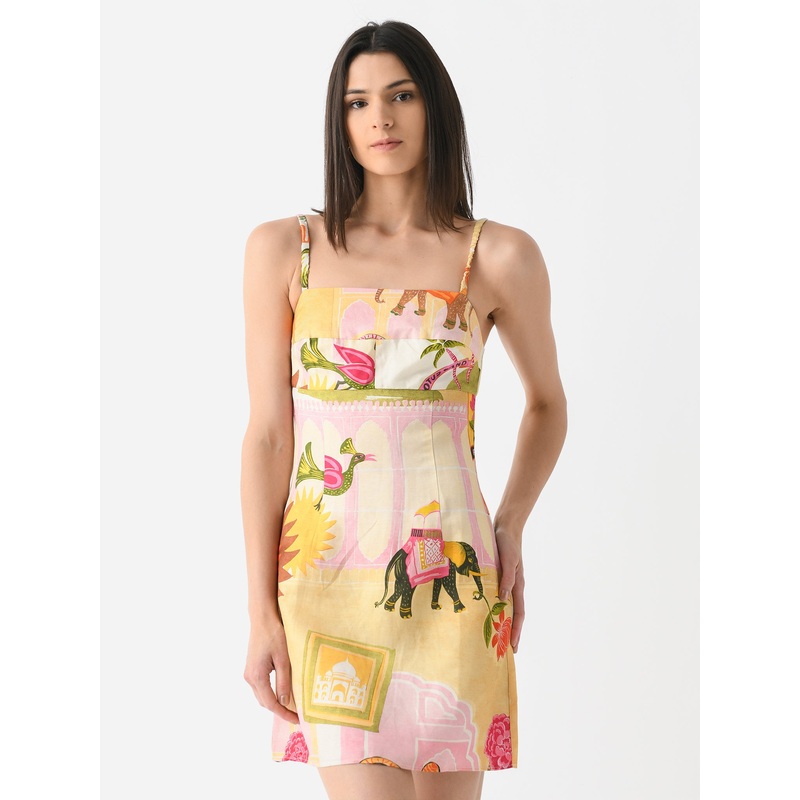 DESCRIPTION:A mini-length dress crafted from a luxe linen blend with elastic straps and a structured bodice.FEATURES:Square NecklineRuched StrapsBack Zip ClosureStructured BodiceAll-Over Novelty PrintMini Silhouette34% Linen, 34% Rayon, 32% ViscoseClassic