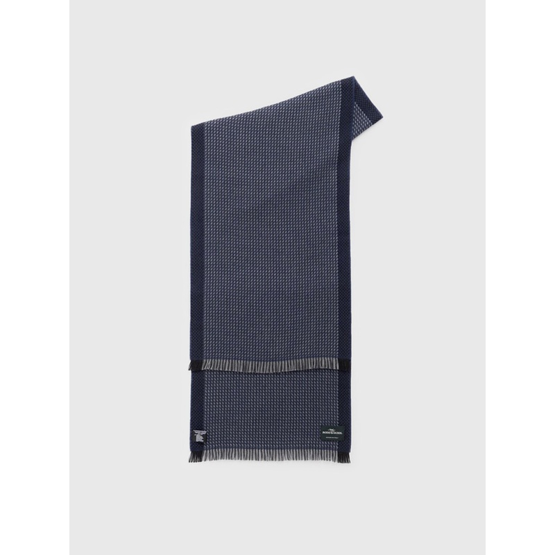 The Dunedin Scarf is crafted in Italy from Australian virgin wool. It features a tonal weave with a border-edge pattern and a subtle fringe, offering a luxurious and timeless accessory.