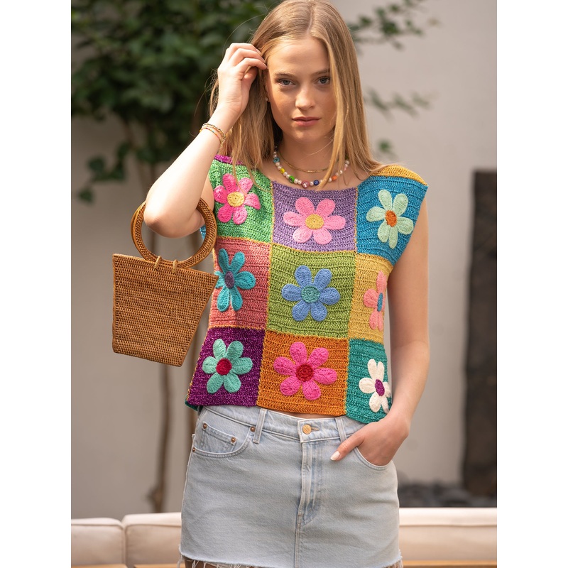 DESCRIPTION:Hand-knitted top with colorful patchwork and floral appliqus.FEATURES:TopRound NecklineSleevelessMulti-Colored PatchworkStraight HemFlower AppliqusKnit FabricationCotton/Lurex BlendRelaxed FitModel is wearing O/S top.Model's Measurements: Heigh