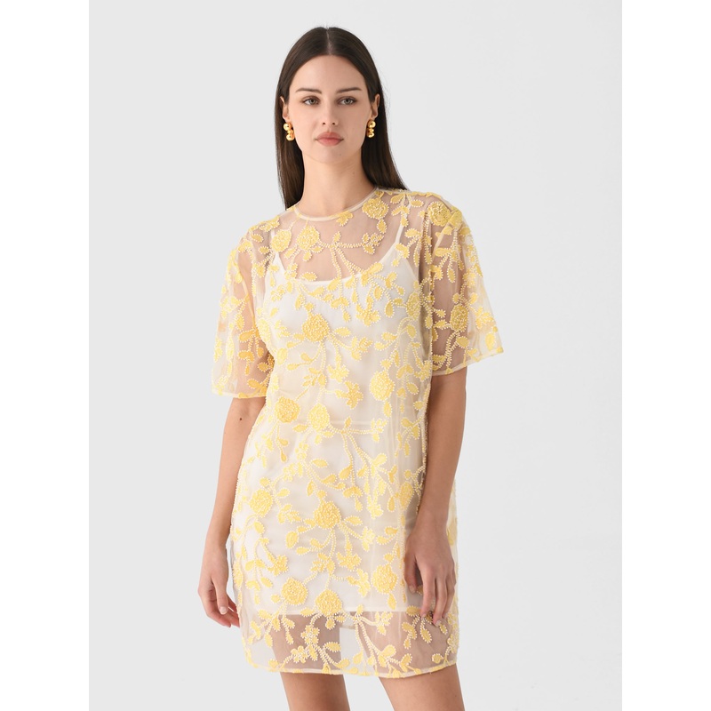 This boxy mini dress features a full slip dress lining and intricate floral embroidery throughout.
