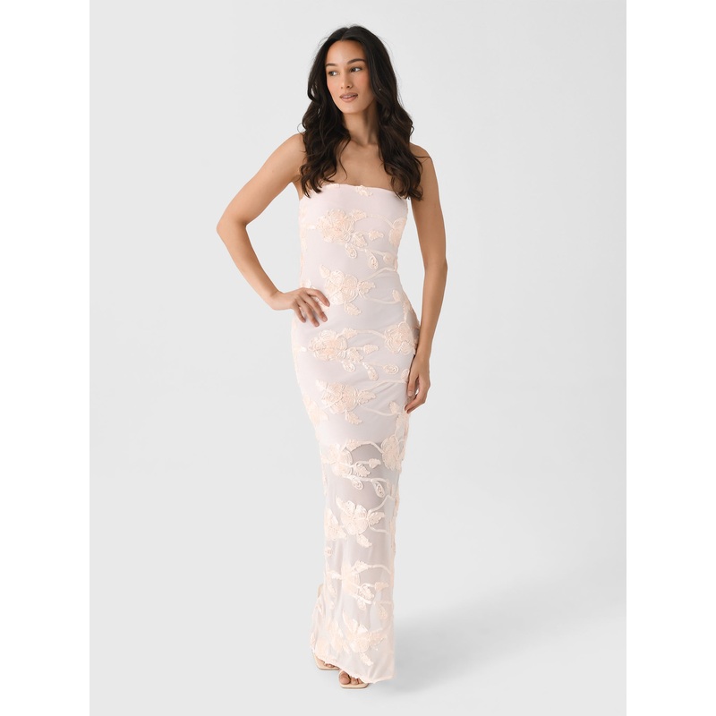 DESCRIPTION:This elegant maxi dress features a mesh construction with 3D floral embroidery and a partial mini lining.FEATURES:Strapless NecklineBack Zip ClosureBack Split Hem3D Floral EmbroideryPartial LiningMaxi Silhouette95% Recycled Polyester, 5% Elasta