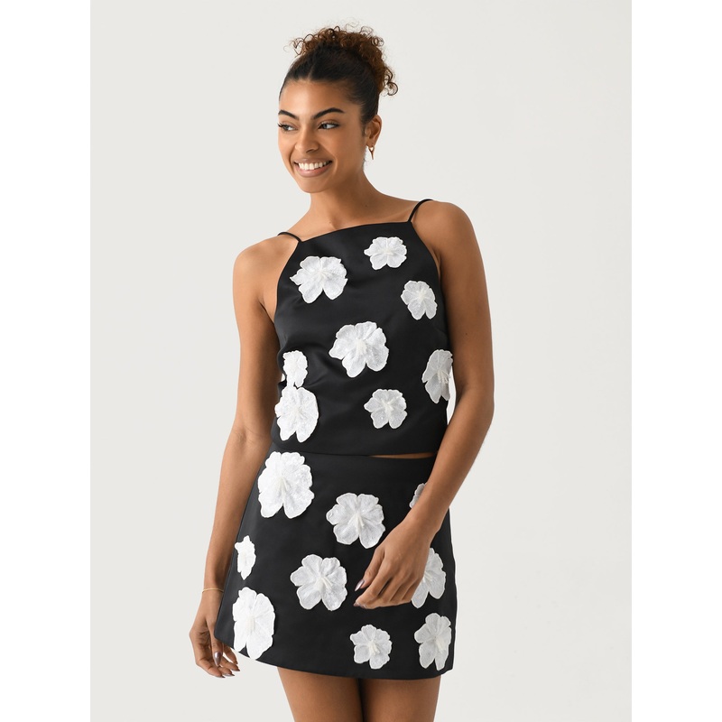 DESCRIPTION:A slightly cropped blouse made from sustainable, heavyweight satin and finished with 3D floral appliqus.FEATURES:High NecklineThin, Fixed StrapsSide Zip ClosureFloral AppliqusCropped SilhouetteSatin Fabrication100% Recycled PolyesterClassic Fit