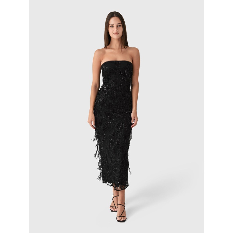 This showstopping midi dress is designed to make a statement. The strapless, fitted silhouette is held securely in place with an inner silicone tape, so you can feel confident all night. Intricately embroidered with sequins and finished with beaded fringe from top to bottom, this dress catches the light with every move.