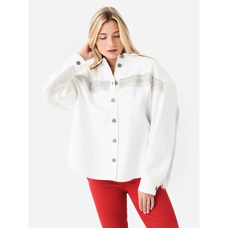 Oversized cotton twill button-down shirt featuring a unique crystal fringe trim detailing on the front, back, and sleeves.