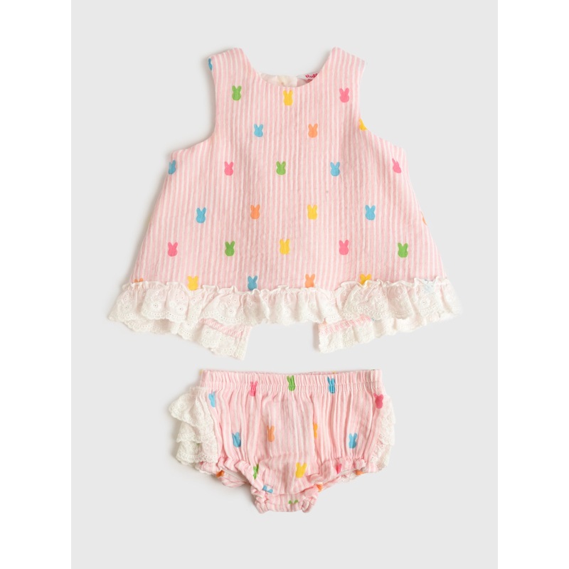 DESCRIPTION:This top and bloomer set is made from lightweight cotton gauze with a custom stripe and bunny print.FEATURES:Round NecklineBack Button ClosureOpen BackRuffle TrimMatching Diaper CoverBack Ruffle DetailAll-Over Novelty Print100% Cotton GauzeClas