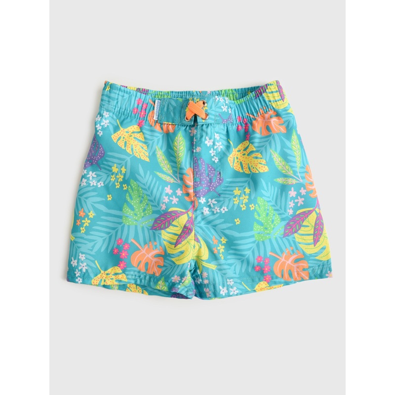 This swim trunk features a fun tropical print with colorful leaves and flowers with added sun protection technology.