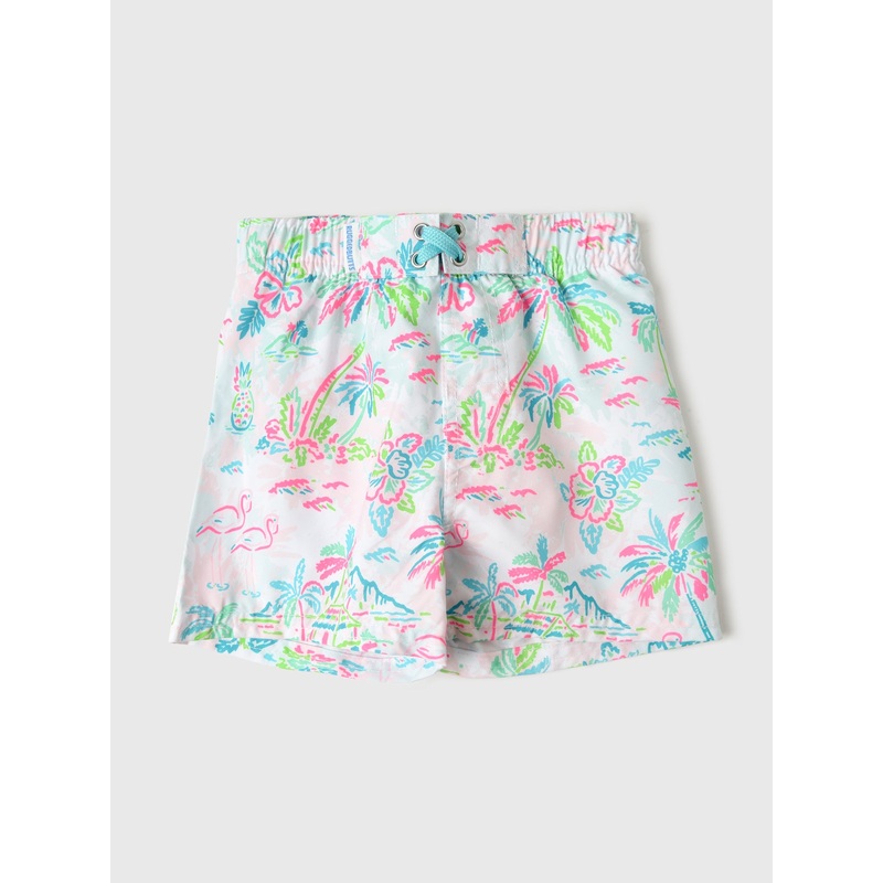 DESCRIPTION:This adorable swim trunk is perfect for your little one's fun-filled days at the beach or pool. The light blue background showcases a vibrant tropical print with palm trees, pineapples, and hibiscus flowers, adding a touch of island charm to th