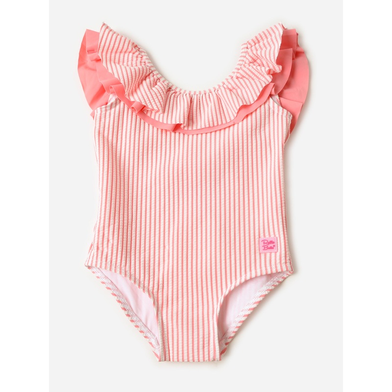 A striped, seersucker one-piece swimsuit with whimsical ruffle trim and comfortable scoop design.