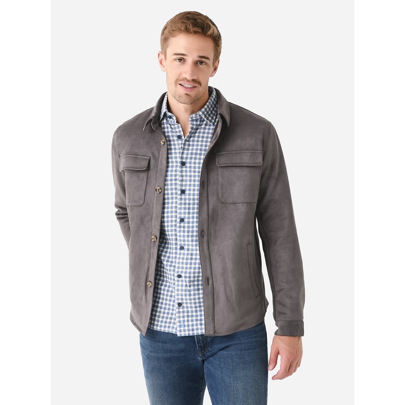 A modern microsuede jacket with hand-finished interior seams.