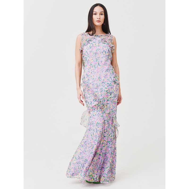 DESCRIPTION:Max length dress with lightweight cascading frill details.FEATURES:Maxi DressRound NecklineGentle Flounce At ShouldersSymmetrical Cascading Frill DetailsFitted WaistConcealed Zip Centre Back FasteningOuter: 100%Silk Lining: 100% Polyester