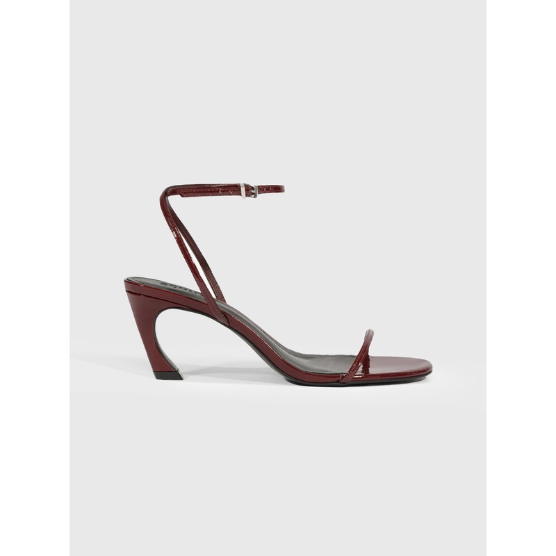 DESCRIPTION:Sleek and sculptural, the Siena Mid Curve sandal does the most with the least. Its glossy patent leather catches the light with every step. A curved mid-heel nods to futuristic form, while thin straps keep it grounded in classic cool.FEATURES:O