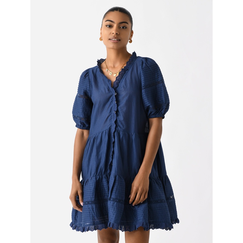 DESCRIPTION:An easy-fitting tunic-style dress made from lightweight cotton with ruffle trims, inset lace, and pleated details throughout.FEATURES:V-NecklinePuff SleevesRuffle TrimsButton-Down FrontSide PocketsInset Lace & Pleated DetailsMini Silhouette100%