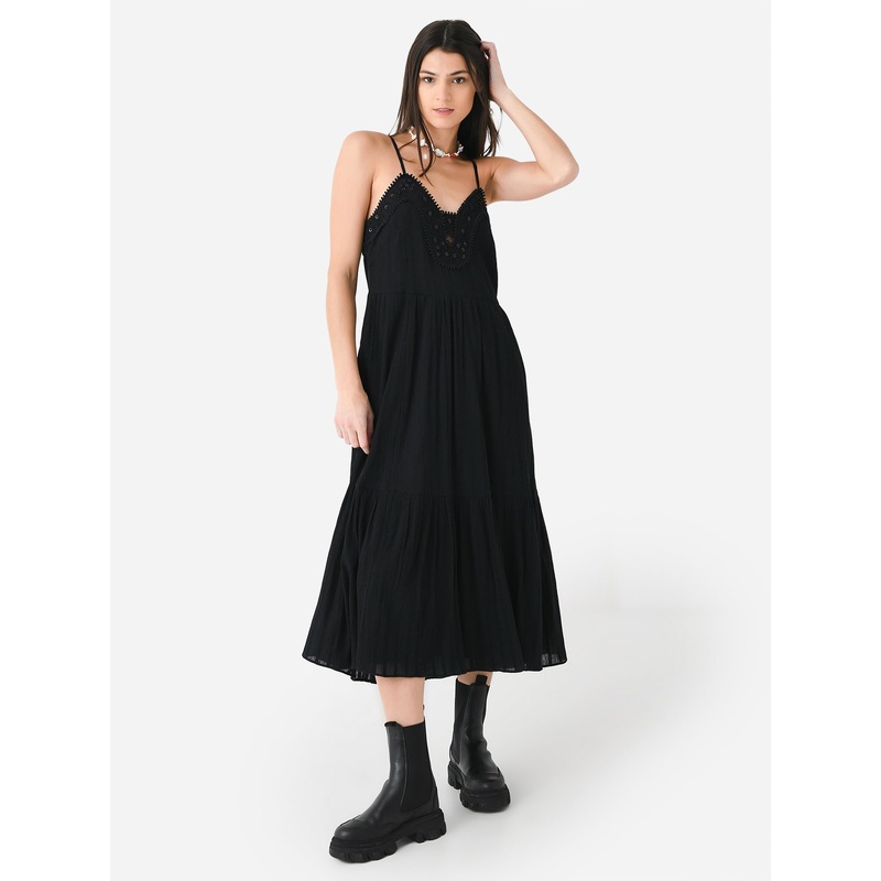 DESCRIPTION:Mid-length black dress with a beautiful embellished neckline.FEATURES:V-NecklineThin StrapsCenter CutoutEmbellished DetailsTiered SkirtMidi SilhouetteCottonClassic FitModel is wearing size Small dress.Model's Measurements: Height: 5'9.5" | Bust