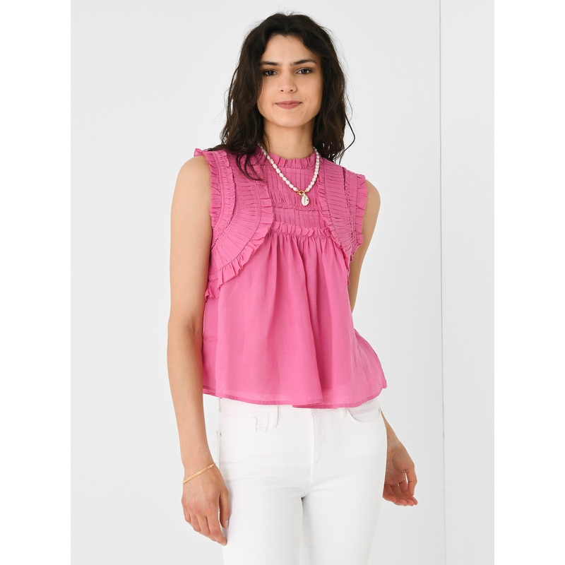 DESCRIPTION:A lightweight tank designed for an easy fit featuring smocked details and ruffle trims.FEATURES:High NecklineBack Button ClosureSmocked DetailsRuffle Trims100% RamieRelaxed FitModel is wearing size Small tank top.Model's Measurements: Height: 5