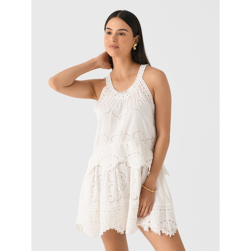 DESCRIPTION:A trapeze-style eyelet embroidered dress made from lightweight cotton with a tiered ruffle hem.FEATURES:High NecklineFixed StrapsBack Zip ClosureSide PocketsTiered SkirtScalloped HemMini SilhouetteEmbroidered Eyelet Fabric100% CottonRelaxed Fit