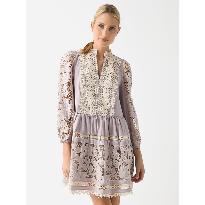 A beautiful tunic-style dress featuring delicate embroidered lace detailing throughout.