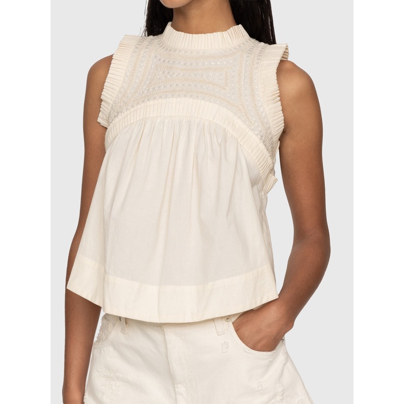 DESCRIPTION:This sleeveless blouse is made from lightweight cotton and features an intricately embroidered yoke and ruffle trims.FEATURES:High NecklineBack Keyhole Button ClosureSleevelessEmbroidered YokeRuffle Trims100% CottonClassic Fit