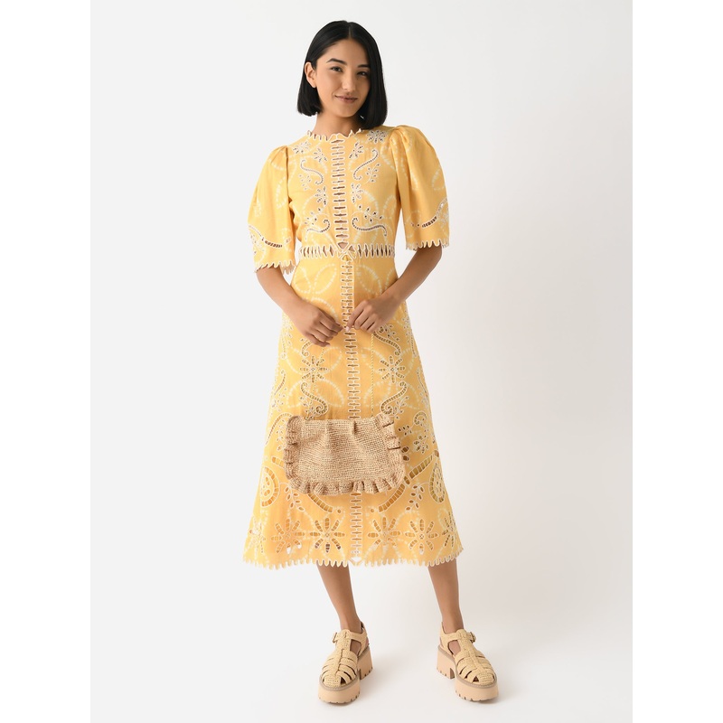 DESCRIPTION:Slim-fitting cotton dress featuring delicate floral eyelet detailing with cutout accents and scalloped trims.FEATURES:Round NecklineBack Zip ClosurePuff SleevesEyelet EmbroideryScalloped TrimsLong Silhouette88% Cotton, 12% FlexSlim FitModel is