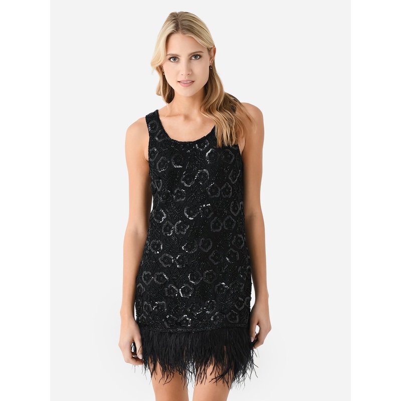 DESCRIPTION:Black mini dress featuring embellished sequins and a feather hem.FEATURES:Scoop NecklineWide StrapsDrop WaistSequin DetailsTiered Feather HemCotton BlendClassic FitModel is wearing size 4 dress.Model's Measurements: Height: 5'10.5" | Bust: 32B