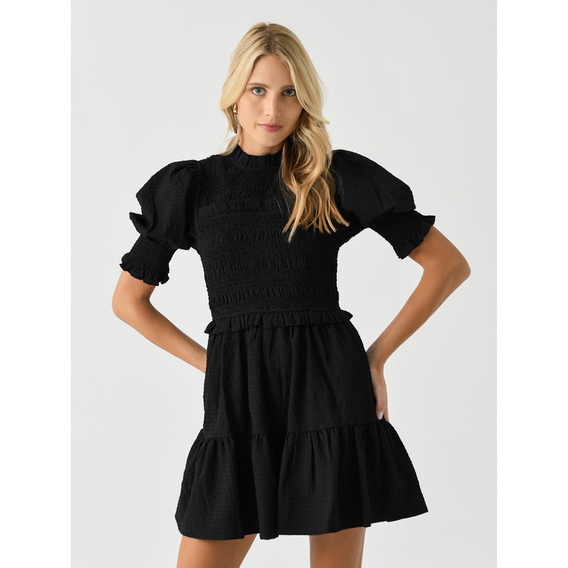 DESCRIPTION:A puff sleeve mini dress made from soft seersucker fabric with a smocked bodice and ruffle trims.FEATURES:High NecklineBack Zip ClosurePuff SleevesSmocked BodiceRuffle TrimsTiered SkirtMini Silhouette95% Polyester, 5% CottonClassic FitModel is