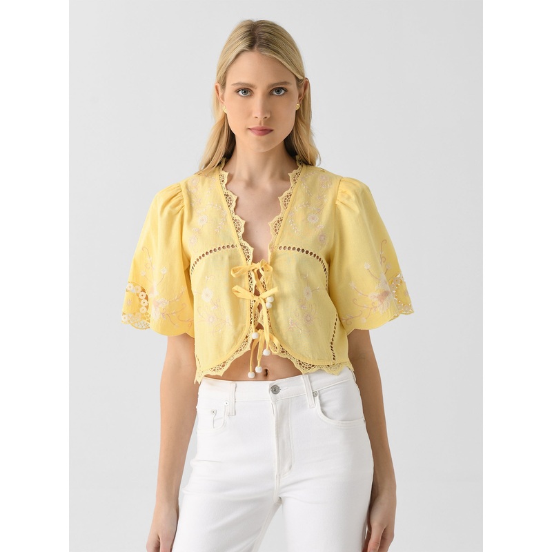 DESCRIPTION:This feminine blouse features intricate cross-stitch embroidery and delicate crochet trim, adding a touch of handcrafted charm. The front tie closure and cropped silhouette create a flattering and feminine look.FEATURES:V-NecklineFront Self-Tie