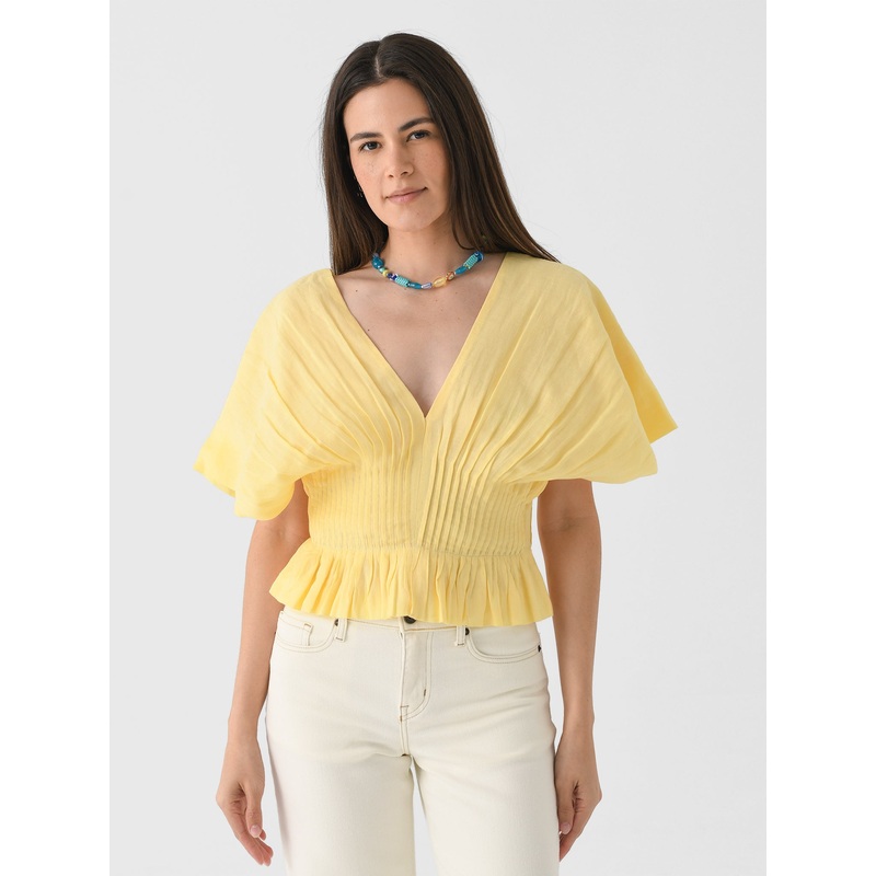 DESCRIPTION:This dramatic design features oversized sleeves, a pleated bodice, and a deep v-neckline for a look that's both bold and feminine.FEATURES:V-NecklineOversized SleevesSide Zip ClosurePleated BodiceRuffle Hem100% RamieClassic FitModel is wearing