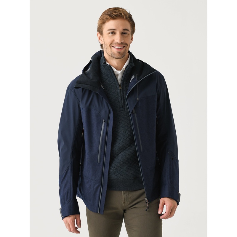 A three-layer shell jacket made from virgin wool with a water-repellent membrane for all-day comfort.