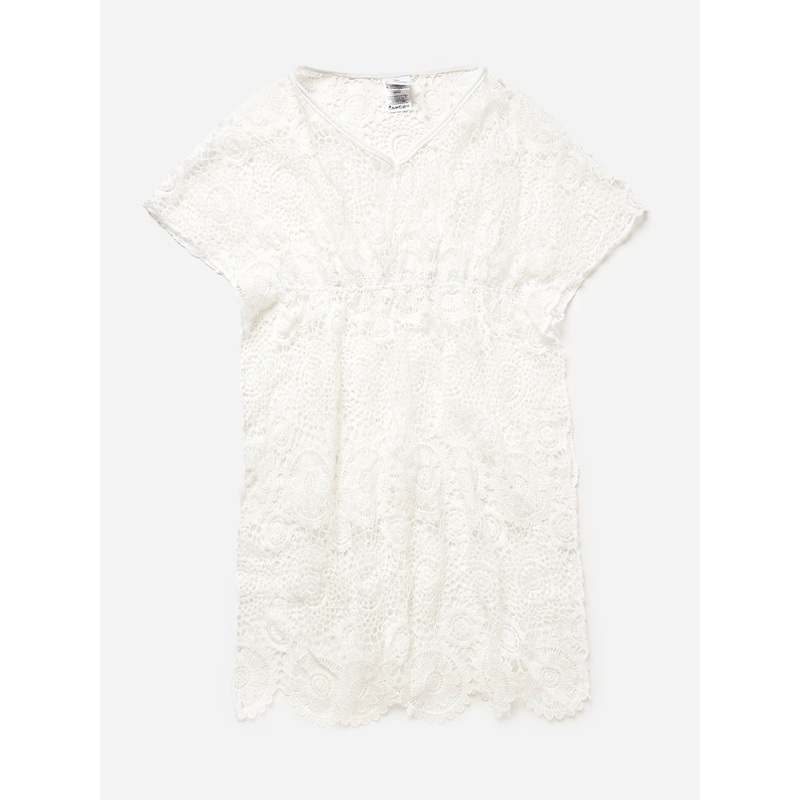 DESCRIPTION:A white swim cover-up with beautiful crochet detailing.FEATURES:V-NecklineElastic WaistbandCrochet FabricationPolyesterRelaxed Fit